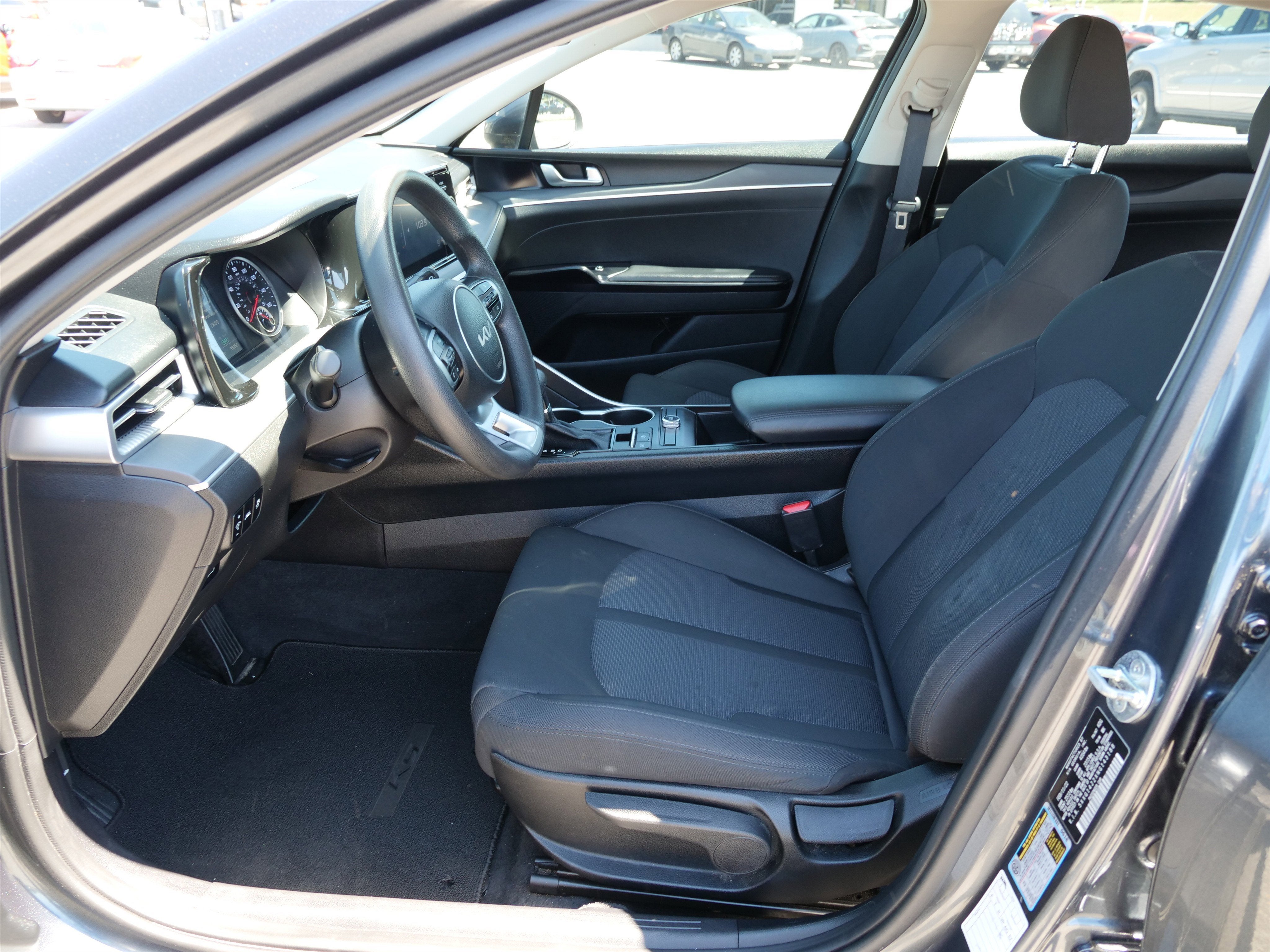 Gravity Gray 2022 Kia K5 LXS FWD 8-Speed Automatic I4 4-Wheel Disc Brakes, 6 Speakers, ABS brakes, Air Conditioning, Alloy wheels, AM/FM radio, Auto High-beam Headlights, Automatic temperature control, Brake assist, Bumpers: body-color, Carpeted Floor Mats, Cloth Seat Trim, Delay-off headlights, Driver door bin, Driver vanity mirror, Dual front impact airbags, Dual front side impact airbags, Electronic Stability Control, Four wheel independent suspension, Front anti-roll bar, Front Bucket Seats, Front Center Armrest, Front dual zone A/C, Front reading lights, Fully automatic headlights, Heated door mirrors, Illuminated entry, Knee airbag, Low tire pressure warning, Occupant sensing airbag, Outside temperature display, Overhead airbag, Overhead console, Panic alarm, Passenger door bin, Passenger vanity mirror, Power door mirrors, Power steering, Power windows, Radio data system, Radio: AM/FM/MP3 Audio System, Rear anti-roll bar, Rear seat center armrest, Rear side impact airbag, Rear window defroster, Remote keyless entry, Security system, Speed control, Speed-sensing steering, Split folding rear seat, Steering wheel mounted audio controls, Tachometer, Telescoping steering wheel, Tilt steering wheel, Traction control, Trip computer, Variably intermittent wipers, and Wheels: 6.5J x 16 Gray Alloy.